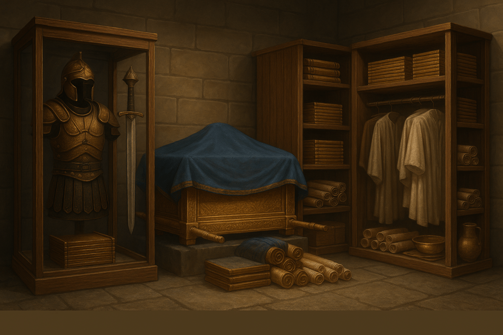 Some of the sacred artifacts that would have been kept in the treasuries maintained by the Levites, in addition to the ark, would have included gold and silver from spoils of war (1 Kings 7:51; 2 Chronicles 5:1), tithes and contributions (Nehemiah 10:38-39), priestly garments and sacred vessels (2 Chronicles 36:18), incense and anointing oils used in ordinances, scrolls of the law and other more durable records, and the Urim and Thummim (Exodus 28:30).