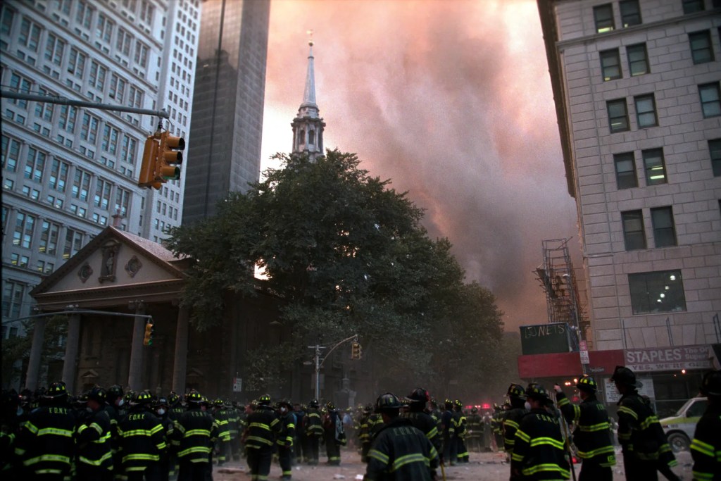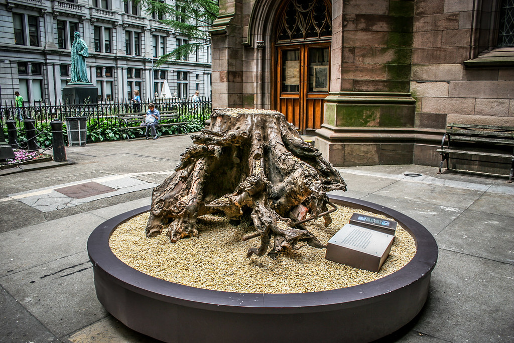 The “bricks” of the Twin Towers fell after a terrorist attack against the United States. Rubble filled the streets damaging several blocks of neighboring buildings. In the courtyard of St. Paul’s Chapel, the block across from the World Trade Center, a sycamore tree shielded the chapel from any major damage, but itself was destroyed in the process.