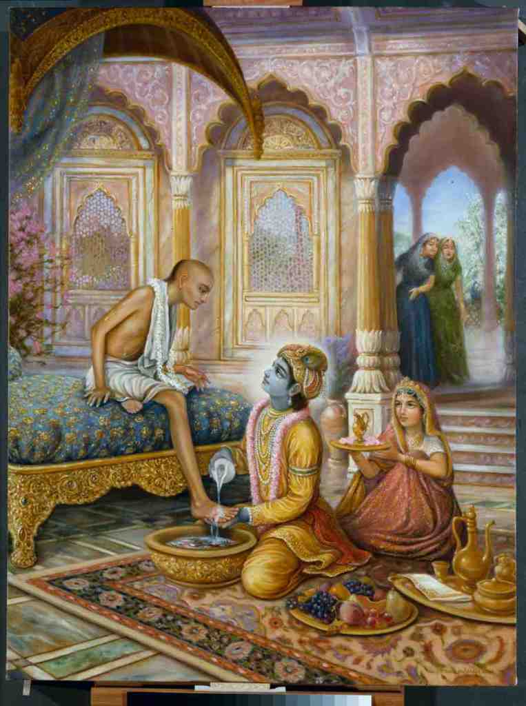 The learned brāhmaṇa (Sudama), joined by some local brāhmaṇas*, passed three guard stations and went through three gateways, and then he walked by the homes of Lord Kṛṣṇa’s faithful devotees, the Andhakas and Vṛṣṇis, which ordinarily no one could do. He then entered one of the opulent palaces belonging to